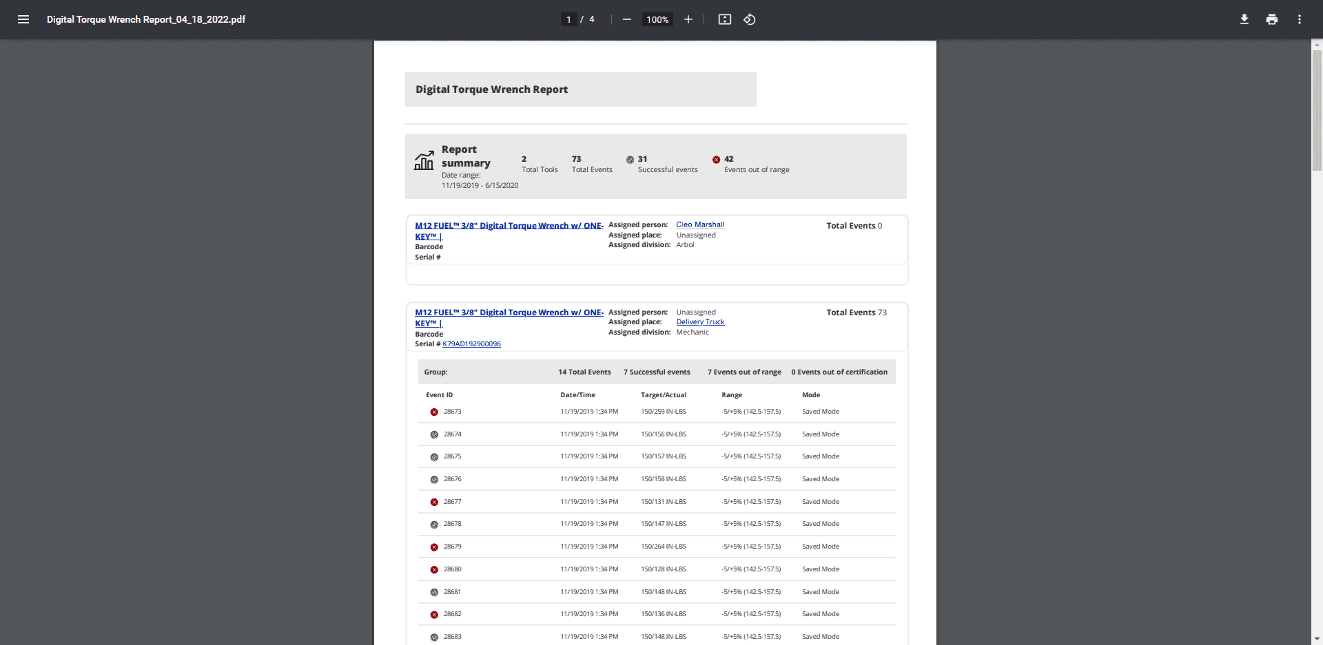 • Digital torque wrench report: A hyperlink on your exported torque wrench report can be clicked on within this PDF report, which will launch the One-Key app in your web browser and direct you to the specific torque wrench’s details page, assuming you’re logged in. If you’re not logged in, you will be redirected to the One-Key login screen, from which you’ll be redirected to the appropriate place in the app. Similarly, if you click the assigned place or person specified on this report, you’ll be redirected, respectively, to the place or person’s details page within the One-Key web app.