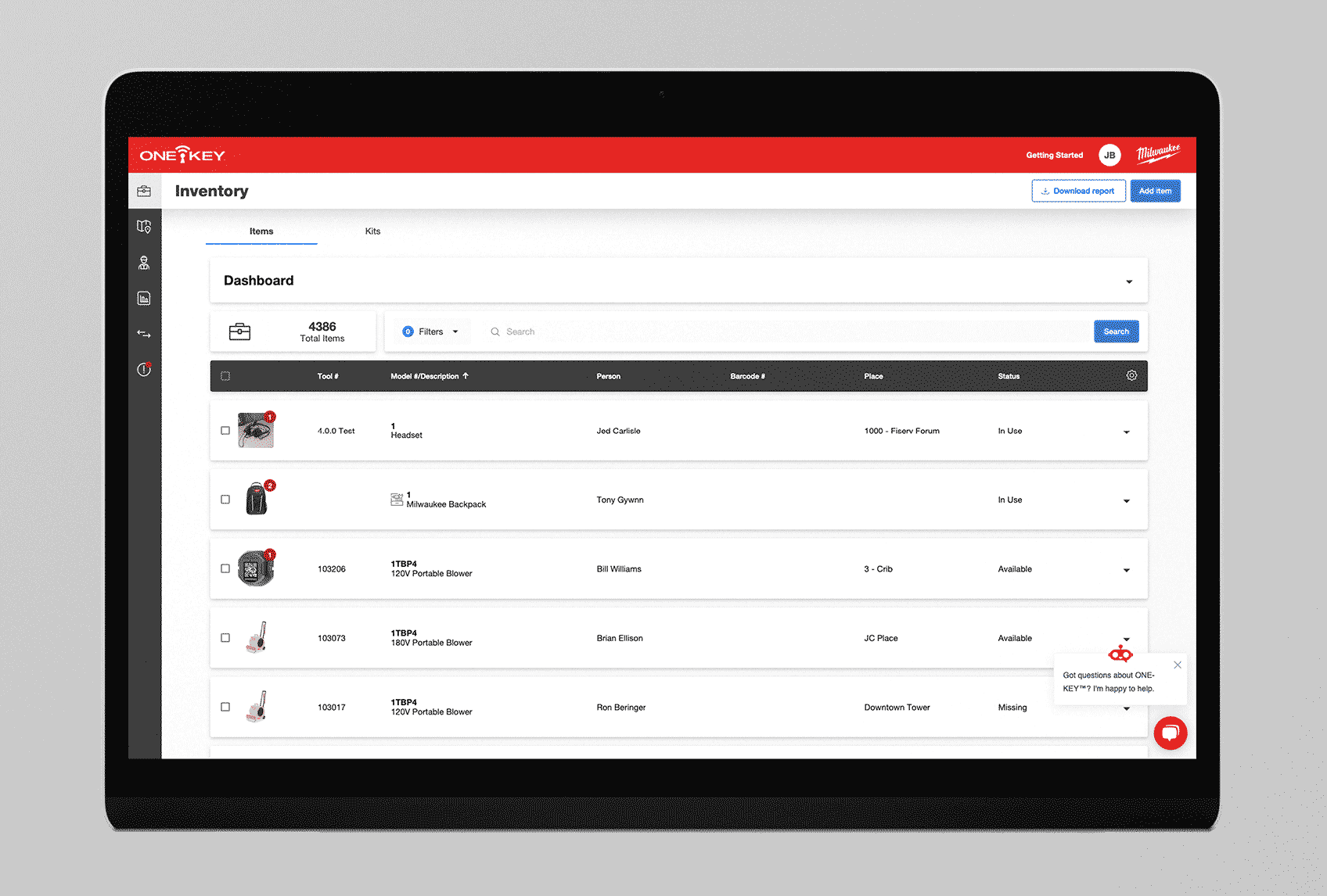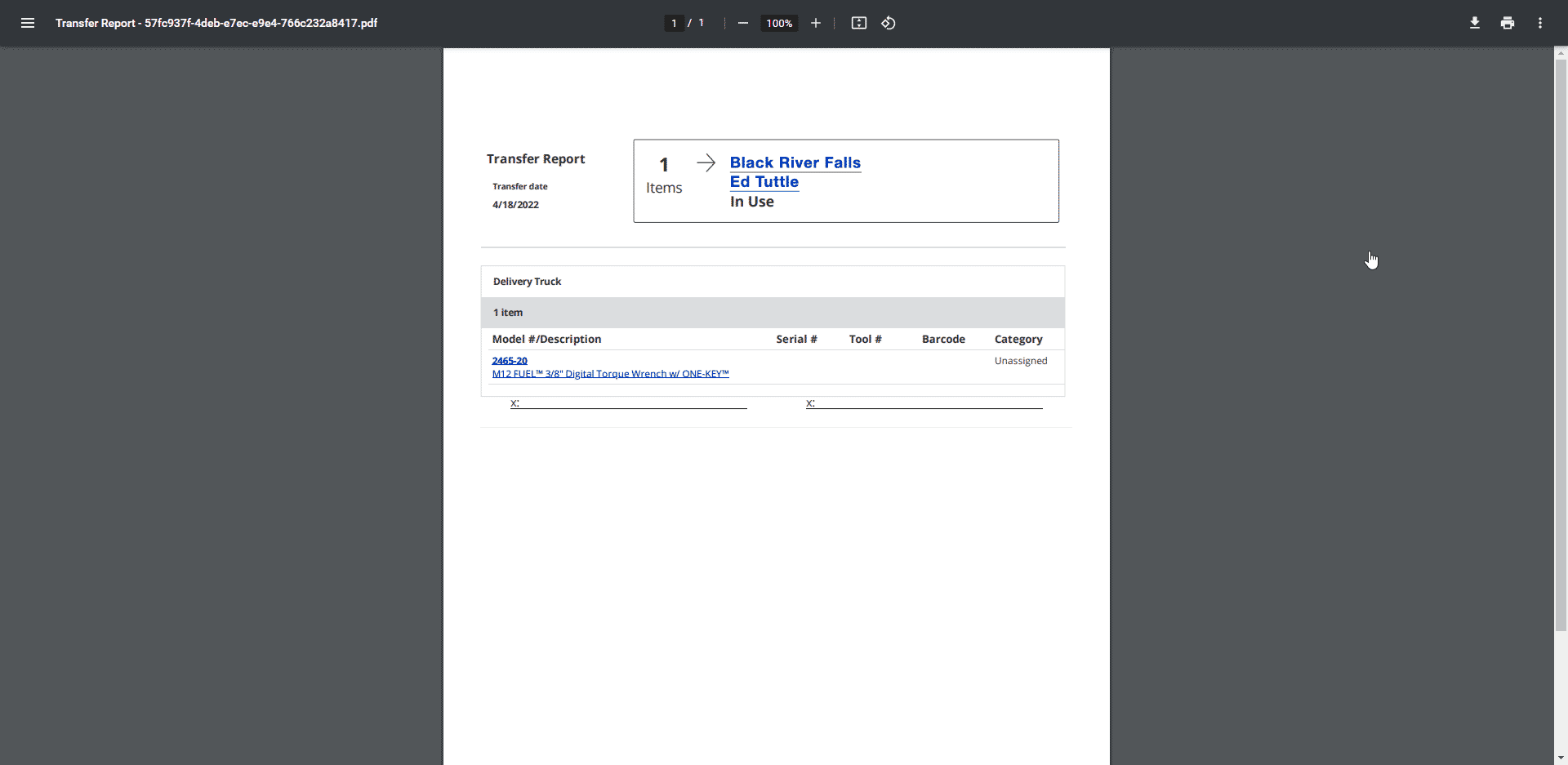 • Transfer report: Several hyperlinks are now present within your exported PDF transfer report. You can click on the transfer location, the person to whom your tools have been transferred, or the individual items within your report. These hyperlinks, when clicked, will open up your web browser and redirect you to the specific area within the app you’ve clicked—assigned person will bring up this person’s contact card, assigned place will bring up the place your tools have been transferred to, and each item hyperlink (name, model number, serial number, or barcode value of the tool) will open that item’s details page.